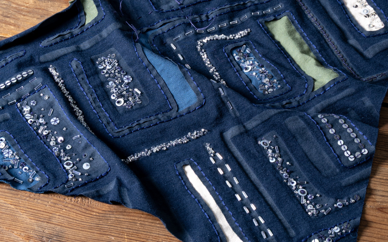 Natalie designed the Sonia Scarf as a way of learning several styles of beading in a manageable first project, and also to learn backstitch reverse appliqué, an embroidery technique that is a foundation of Natalie’s clothing designs.