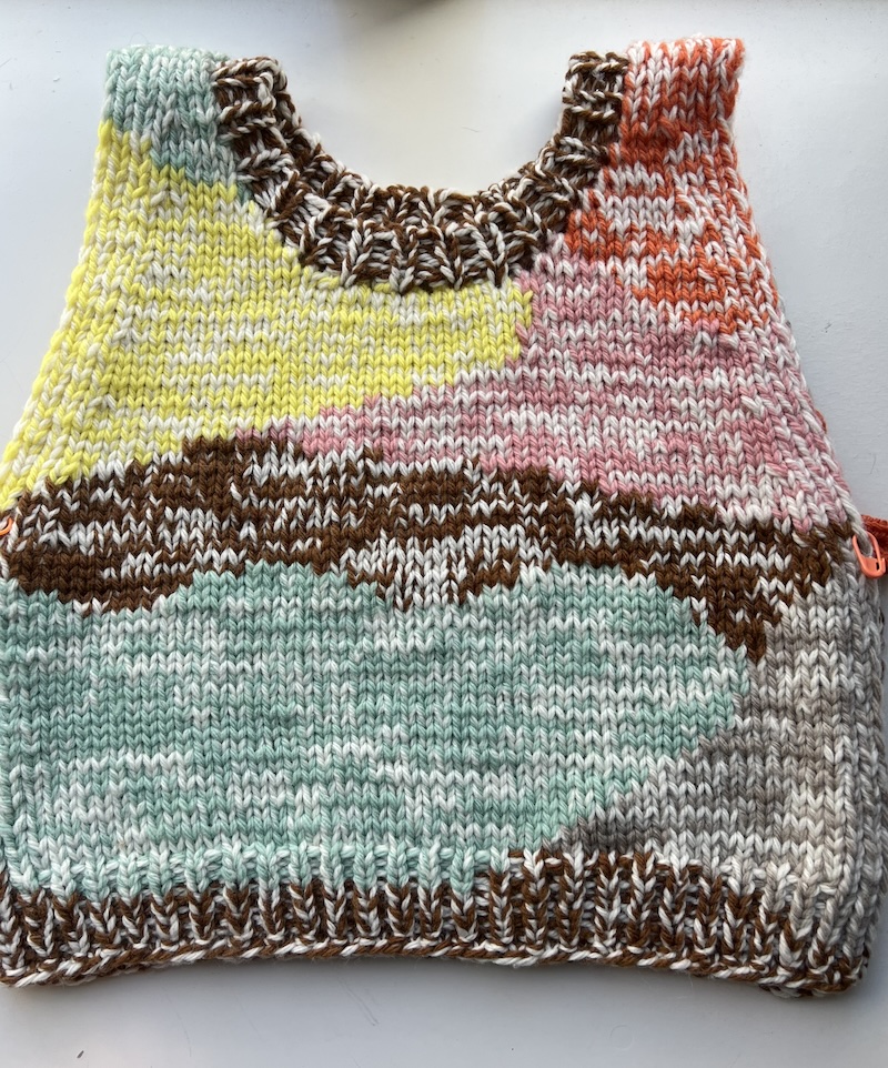 A couple of weeks ago she put out her first testing call, for the Dreamscape Vest. It’s a sleeveless popover with cloudlike intarsia shapes and button loops instead of side seams, worked in two strands of yarn for a kind of marl-tarsia effect. To my astonishment, I put up my hand to make one in child’s size 6-8 years.