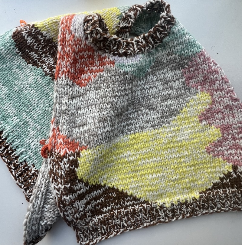 A couple of weeks ago she put out her first testing call, for the Dreamscape Vest. It’s a sleeveless popover with cloudlike intarsia shapes and button loops instead of side seams, worked in two strands of yarn for a kind of marl-tarsia effect. To my astonishment, I put up my hand to make one in child’s size 6-8 years.