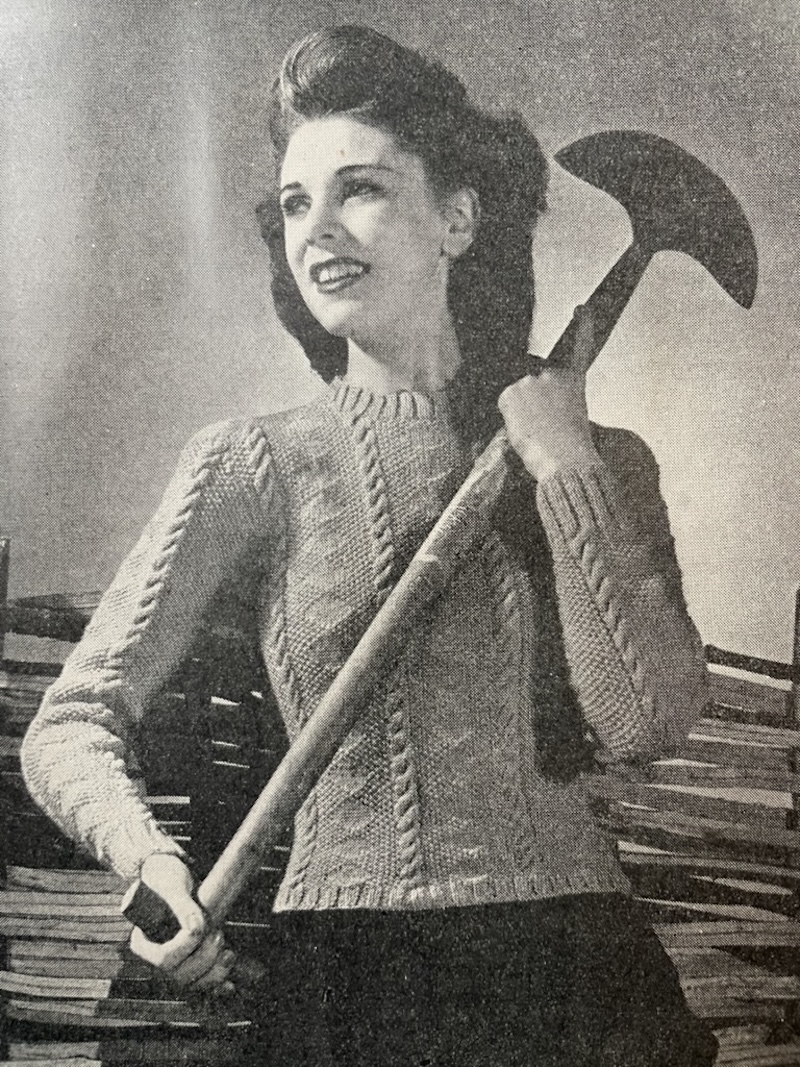 gansey patterns entered mainstream fashion just as the fishing boom ended. Here’s a pattern from the 1944 Complete Home Knitting Illustrated published in London by Odhams. The sweater has the diamond pattern symbolizing the fishing nets and the cable symbolizing ropes. The surrounding raised stitches represent pebbles—all part of the Flamborough gansey!