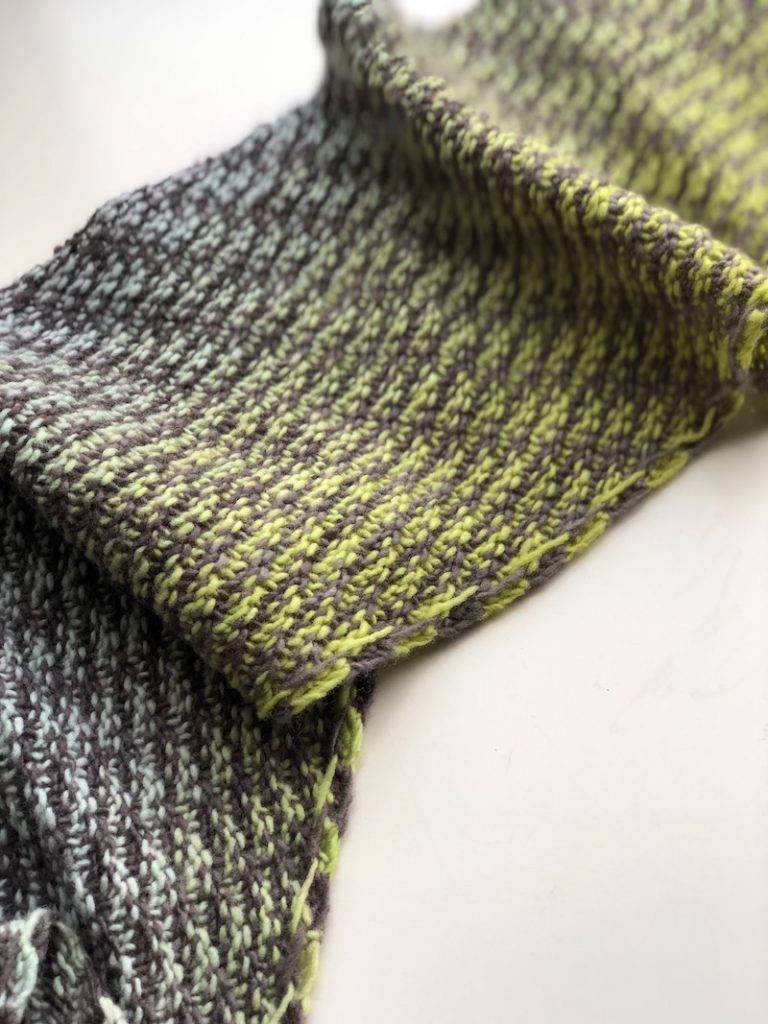 This is the Parallelogram Scarf, by Cecelia Campochiaro, from Modern Daily Knitting Field Guide No. 5: Sequences. The yarn is Freia Fine Handpaints, in our Lichen-Vintage kit.