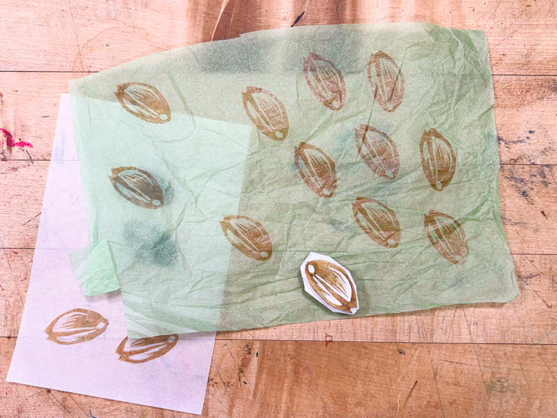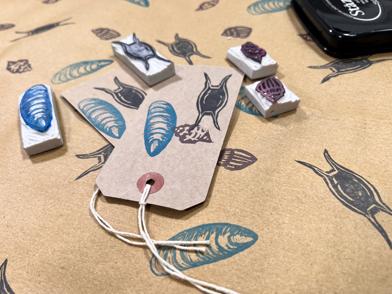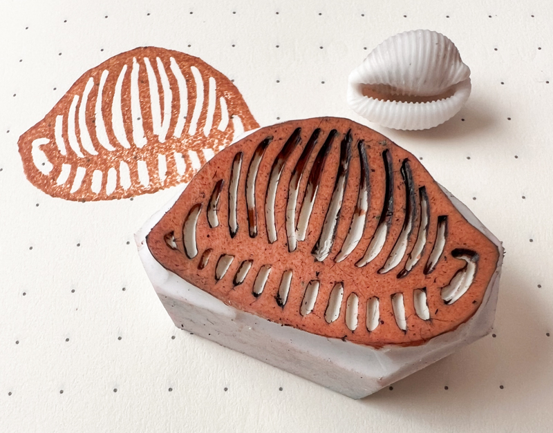 If you ruin your stamp it doesn’t matter: just use everything you’ve learned to try again with a new eraser or on the back of the one you’ve carved. My cowrie design took several goes until I ended up with something I liked. Every try just got me more invested in the mission!