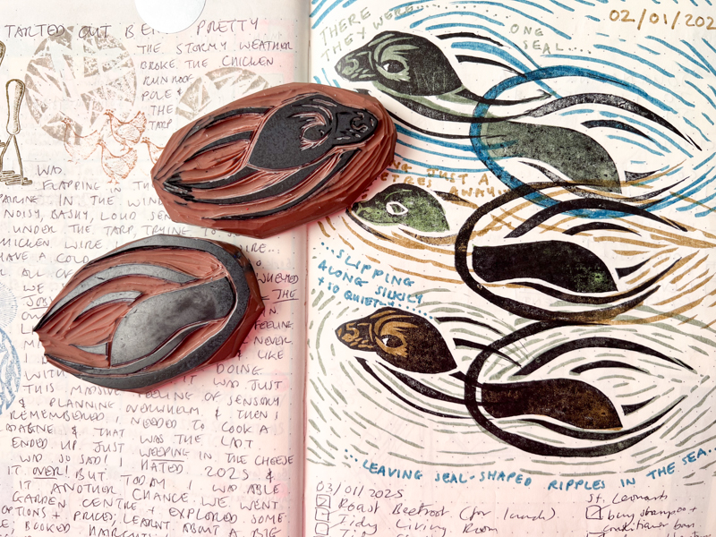 January 1 was an inauspicious start to 2025, spent repairing torn wire mesh on our chicken pen in a howling gale, whilst being slapped in the face by a wet tarpaulin. On January 2, we saw a seal whose gleaming ocean presence set a better tone for the year. I carved a stamp. It has popped up in my journal ever since, a joyful symbol of uplift and kindness.