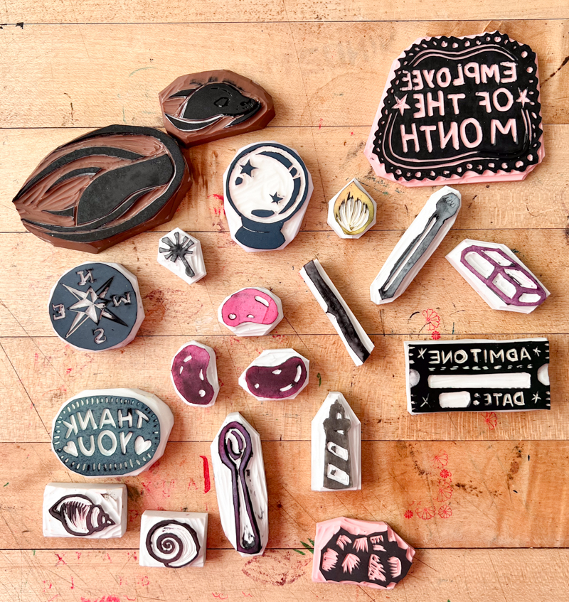 This fills my heart with joy! I love making stamps (I like the white Pentel erasers, personally) and love to see the approach that others take to this intensely fun and addictive work. Can’t wait for your next journaling class!