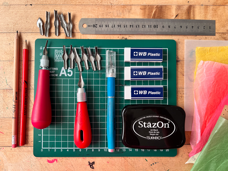 Lino-cutting tools: Essdee (UK) and Speedball (US) make good introductory sets with a handle and interchangeable cutters.