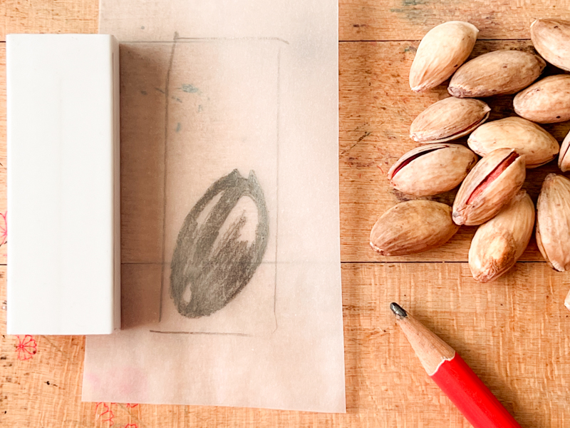 Draw thick lines and remember: when you carve your stamps, you’ll carve away the space around the lines and not the lines themselves. For my example, I’m drawing a pistachio from a pistachio farm we visited on our holidays.