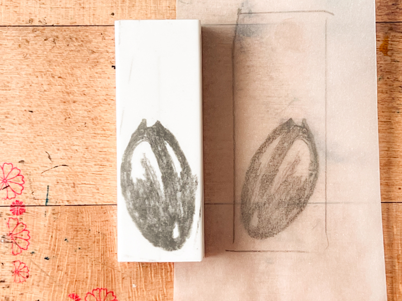 Once your design is drawn on the tracing paper, lay it on your eraser graphite-side down and rub the back firmly. Lift up the tracing paper: your design should have transferred directly onto your stamp and be a mirror image of your drawing.