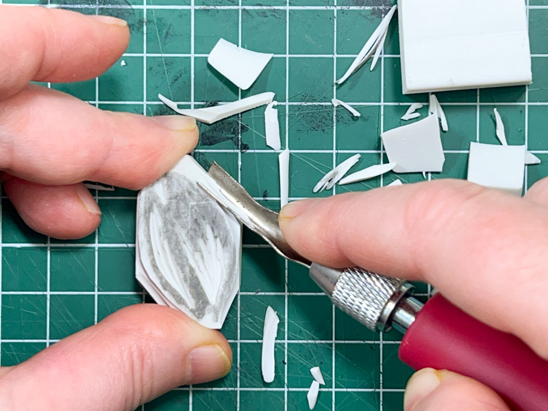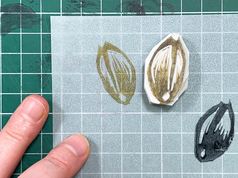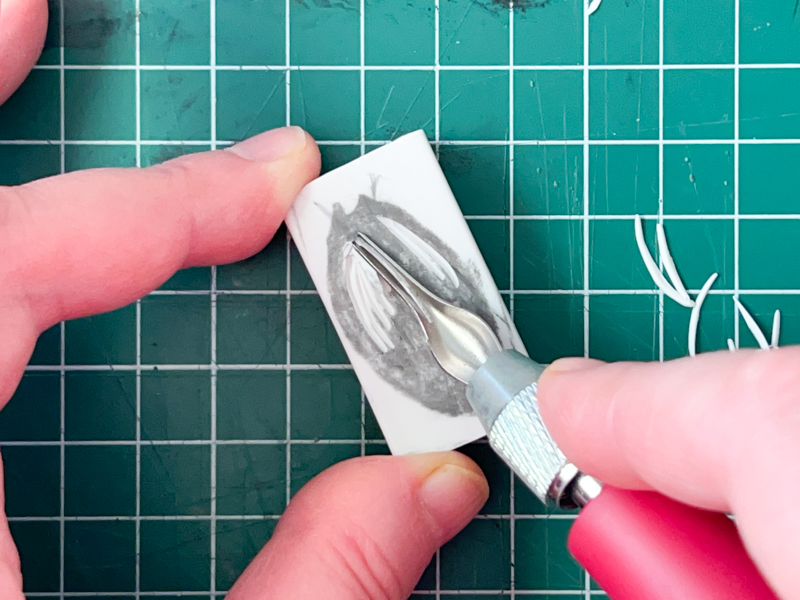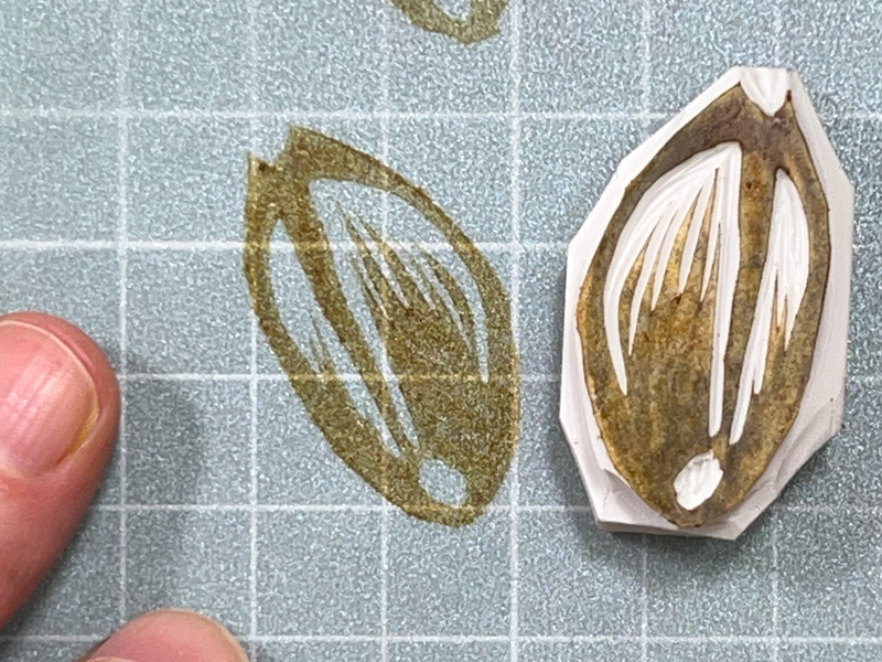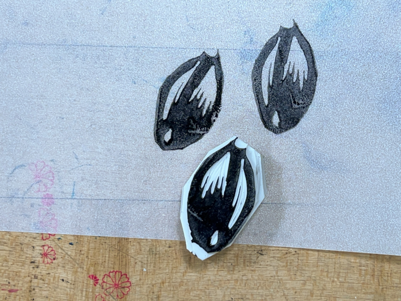 I found a flaw in my eraser—a line that was bothering me—and I wanted to fix the shape at the top, so I started over and made a second stamp on the back of the first.