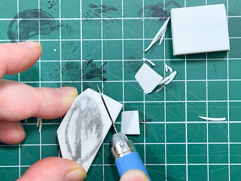 It takes time and practice to understand which cutters to use for different carving tasks but I’d suggest starting with a slim V-shaped cutter to get the fine details first…