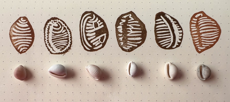 When my nephew found a cowrie (Trivia monacha) on our beach, I carved a stamp. Finding the shell is a moment he remembers and I’ll enjoy wrapping his presents this Christmas in cowrie paper and, perhaps, making a bookmark, too.