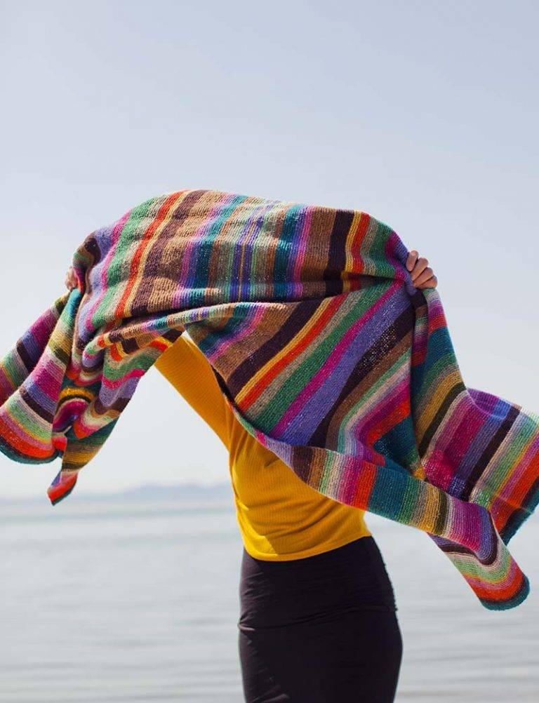 Stranded Stripe ThrowThe Kaffest Kaffe of them all. Knitted in the round, then steeked and edged with a border. If you’ve knitted a colorwork yoke, you can do this. Easier than a sweater: no sleeves!