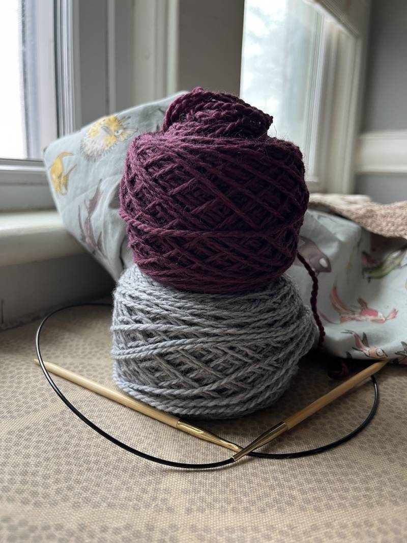 • I received permission from Ann to start early, as I broke my wrist and could not knit for several weeks and am VERY slow still, so I’m well on my way! I’m using Spincycle Metamorphic in a beautiful lilac grey for my main color and Nocturne (in Sleepover) and Dyed in the Wool (Dirty Little Secret) for my B color. I’m loving this pattern and how it’s turning out!!!! Here’s to banging another great sweater!