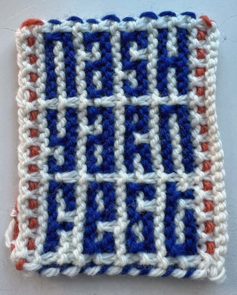 To make this easy, it’s based on simple principles: Garter ridges—knit stitch only, slip-stitches—no long floats, and a simple 8-shaped letterform grid. It’s easy to memorize, sketch, or modify (remember the numbers on your old calculator? Just like that!).