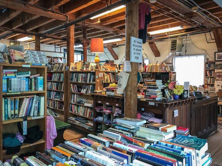 There’s a lovely restaurant, The Alvah Stone, with patio overlooking the waterfalls. There’s also an art gallery, live music for much of the year, and that rare gem, an indie music and movie store. As the website endearingly says, the Book Mill offers  ”books you don’t need in a place you can’t find.”