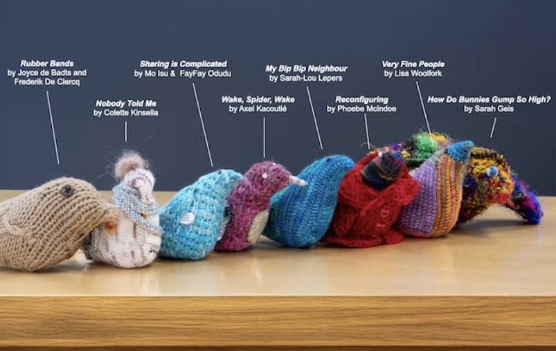 “Wake, Spider Wake” by Axel Kacoutié and “Rubber Bands (most commonly beige)” by Joyce de Badts and Frederik De Clercq use sound effects and word rhythms to tell their stories. Kacoutié speaks out about how the British government, museums, churches, and schools actively destroyed the histories of colonial cultures. Lorna incorporated text into this bird. De Badts and De Clercq present us with a free association sound and word riff starting with rubber bands. Lorna knits that rubber band right into their bird.