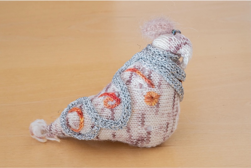 Other fluxwork stories include: the risk of ruining something you love by sharing it with someone you love, attuning yourself to sounds and sensations when you lose your sight, a curious and unexplained “vummmm” sound, and being cancelled from a quilting workshop for speaking truth. For each work, Lorna knitted a perfectly paired bird reply.