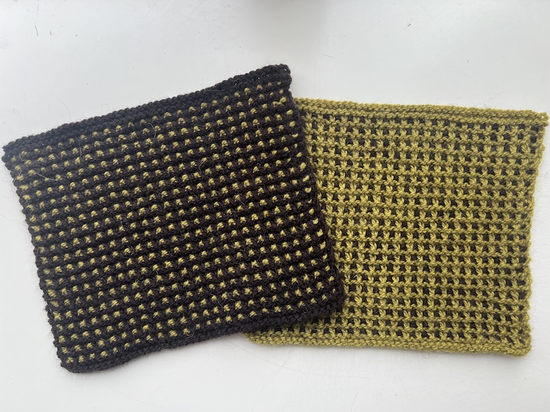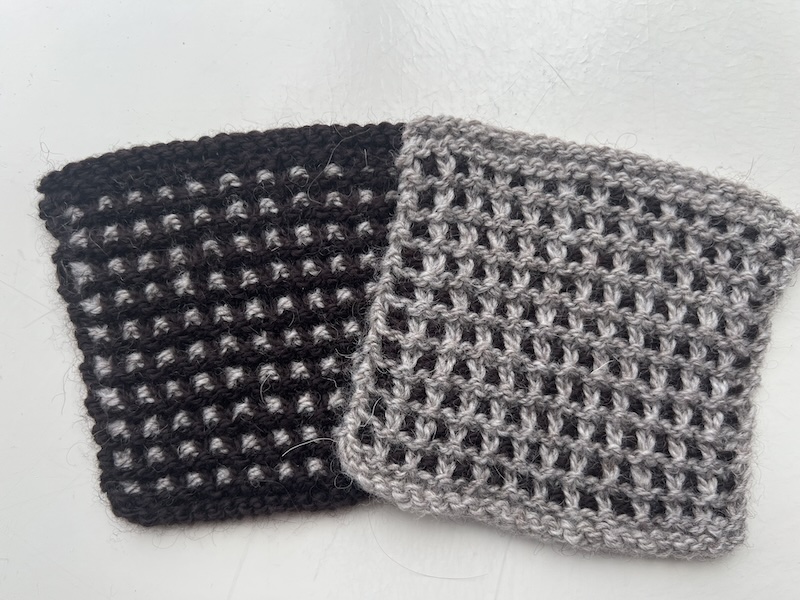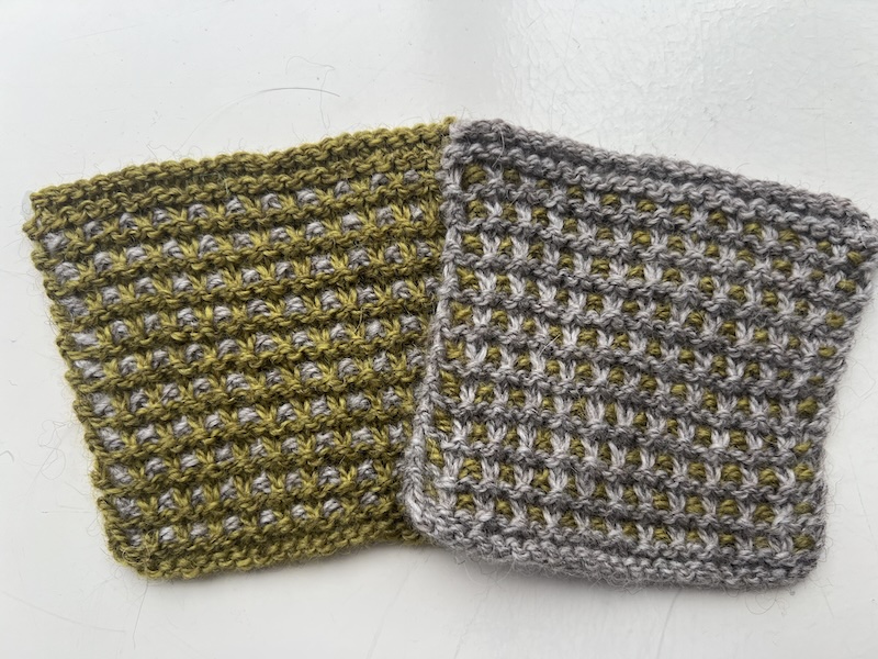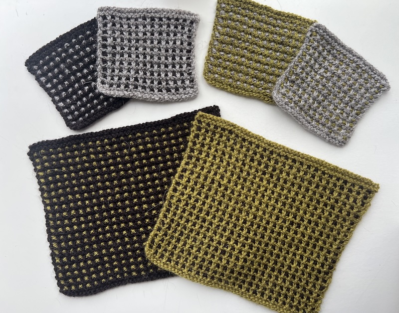 But I think a correction is needed- the mini-swatch needs an odd number of stitches, just like the large swatch instructions have, or else the mosaic doesn’t work.