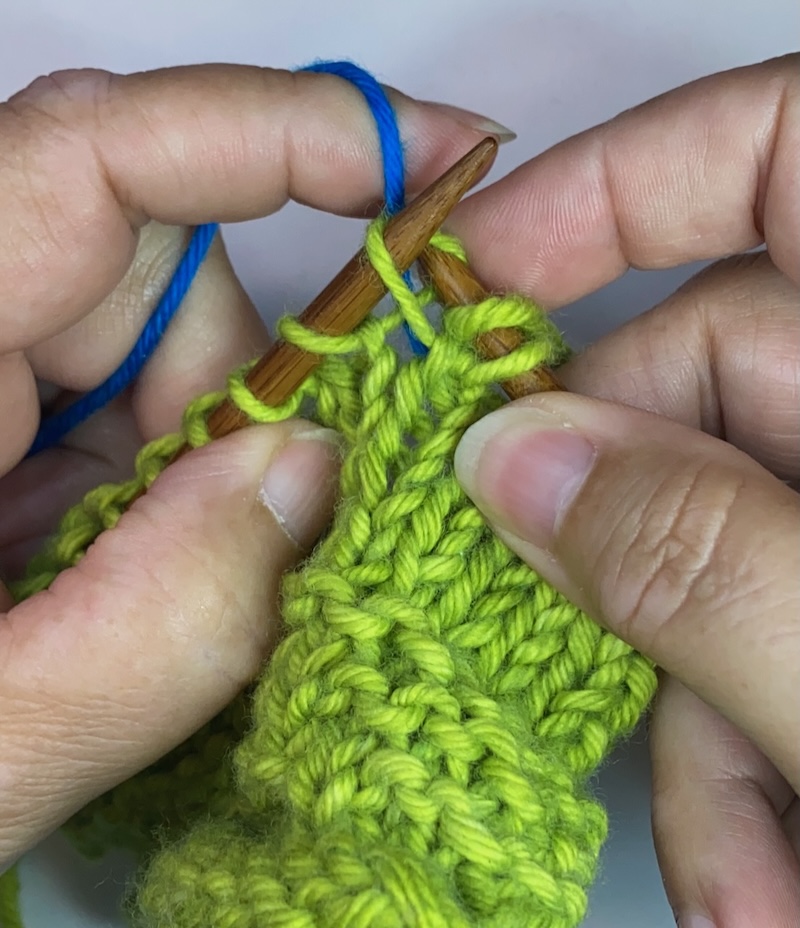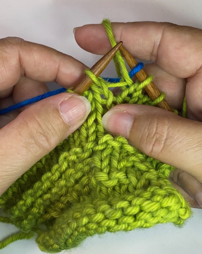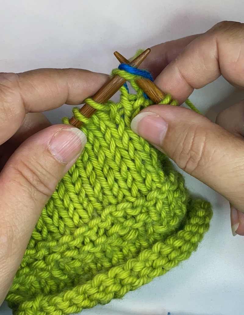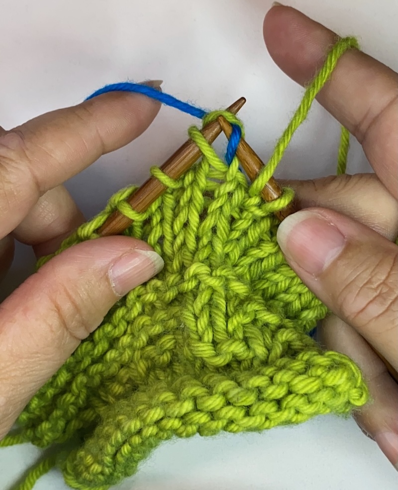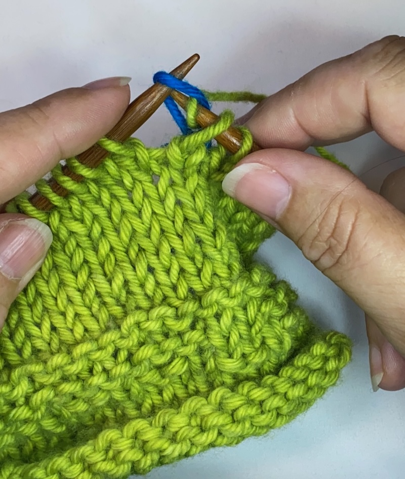With the contrast color, knit into the loop you have picked up so as to twist it by inserting the right needle into the front leg of the picked-up thread.