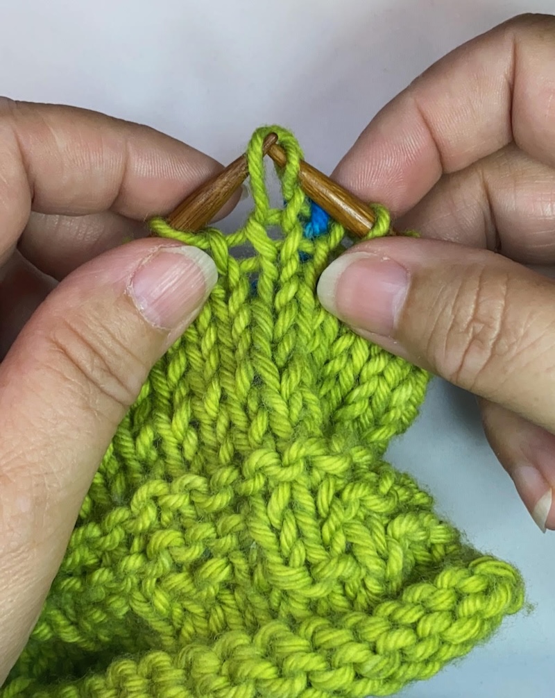 To do this, you’ll need to start your ladder with an increase that’s connected to the fabric. One way to do this is with a right-lifted increase. When you reach the place you want your first ladder to be: