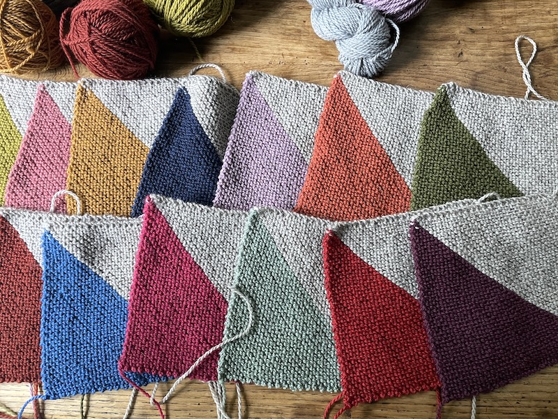 I have no idea. Please stay tuned. For the main color, I chose Yorkshire, the color that shows what the Falklands/Masham fiber looks like undyed. I like its warm gray—it’s the base color that underlies all the other 21 colors.