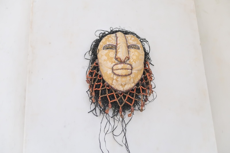 I saw the first one, “Flower Face Mask #1” purely by chance. I happened to look up just above eye level, and there it was staring down at me, its intricately sewn face adorned by beads. I was immediately in awe and inspired.