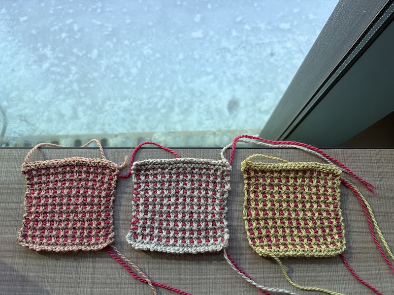 I’ve managed to make three motley swatches—one by the gloom of our gas logs, before we left the house on Sunday for a place with electricity. How did people in the 19th century do anything? All respect to knitters working by candlelight.