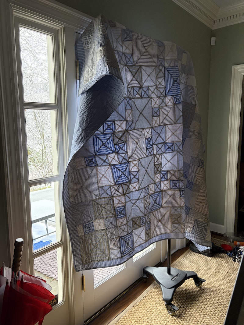 When I see this beautiful quilt, I think of Elmira Sanders in Greenville, Alabama, who made it 20 years ago, using the shirts of Jon’s beloved dad. I wish they could see this setup.