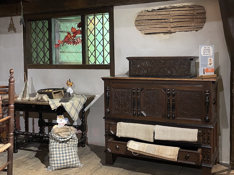 Let’s look at the family’s luggage. Here it is: a chest. The Bible box on top of it, the armor, and the rug would have gone into the chest along with anything else they might have needed in the new world.