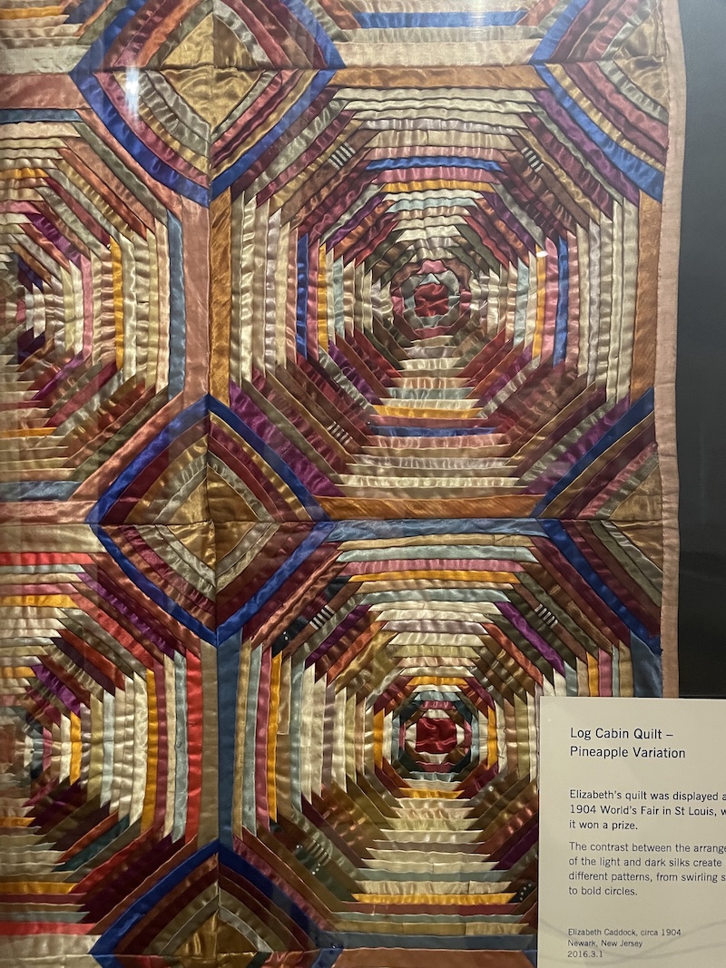 The Museum has a whole room dedicated to quilts with two carousels full of a rotating display of quilts. Log Cabin Pineapple Variation, Elizabeth Caddock, Silk, c. 1904, Newark, NJ.