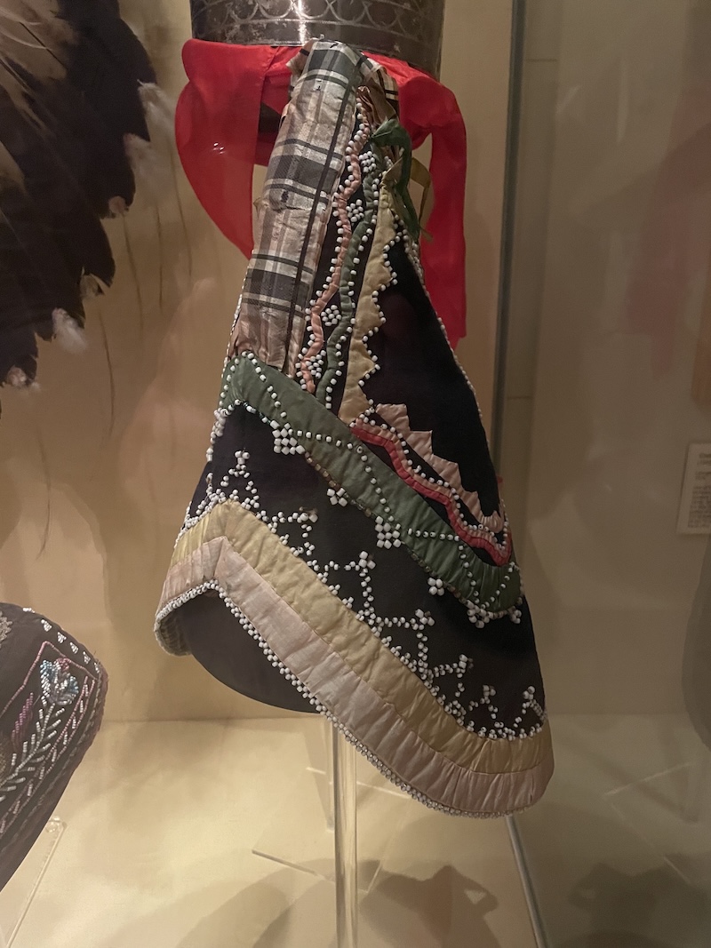 Made by women of the Penobscot tribe, Maine, 1840-60. Hood made of wool trade cloth, decorated with silk ribbons and colored beads from Europe.