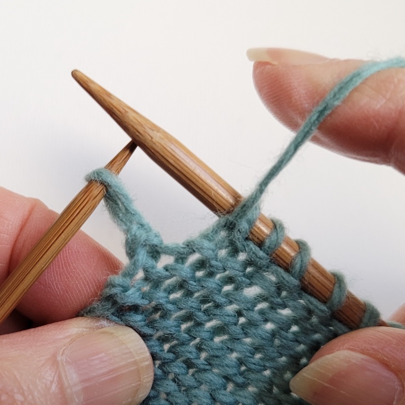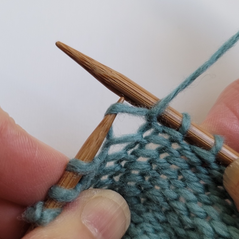 With your empty needle in your left hand, put it into the front of the loop of the stitch below the one on the needle. Let the stitch slip off the right-hand needle and gently tug on the yarn. One stitch undone, and it’s on the left needle correctly seated, right-leg forward.