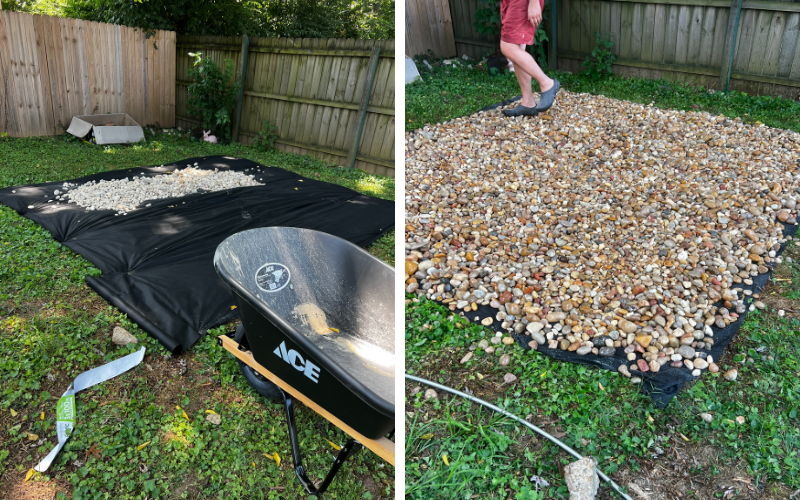 To map out the plot, we laid down several sheets of landscape fabric and began lugging our newly acquired rocks with our also newly acquired wheelbarrow. Note: No step of this project was well-researched or planned, we solely built this area on “sure that works there” and good vibes.