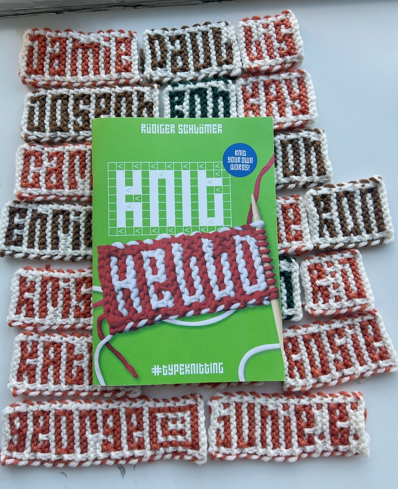 It’s so cool, and so knittable. I knitted these names using the Knit Hello Specimanual, a 32-page booklet that is available in print or ebook here. It has everything you need to knit the dictionary.