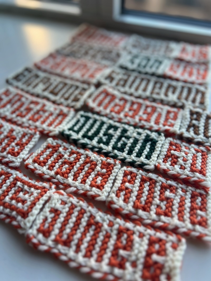 The more letters I knit, the more intuitive and playful the process became. While minimalist, the typeface has so much personality. The letter forms are simple, and their knitting logic is easy and quickly memorized. One color per double row (aka garter ridge), slipped stitches, that’s it. SUCH FUN.
