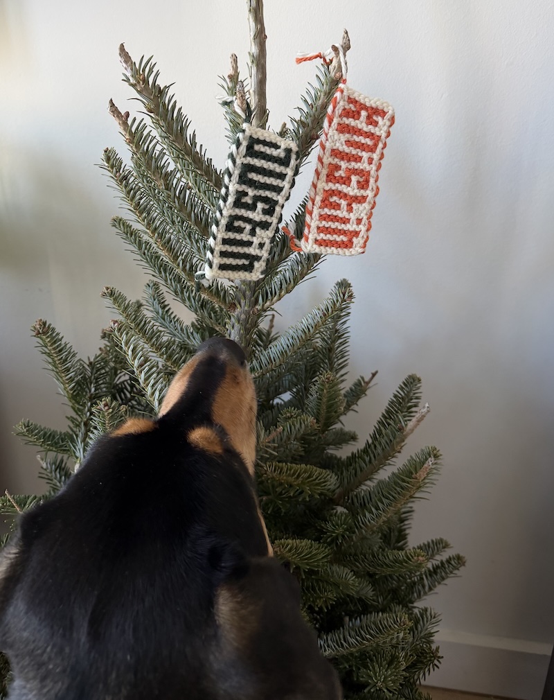 This wee pattern charts out Merry Xmas and Happy 2026, ready-to-knit for all your tree garland, package labeling, and general handknit holiday decor needs.
