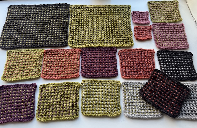 I started with a luxurious 8 x 8 inch swatch that is suitable for framing. Then I did a quarter-size 4 x 4 swatch. One of the latter takes 45 minutes or so. Well worth the time in color-picking power.