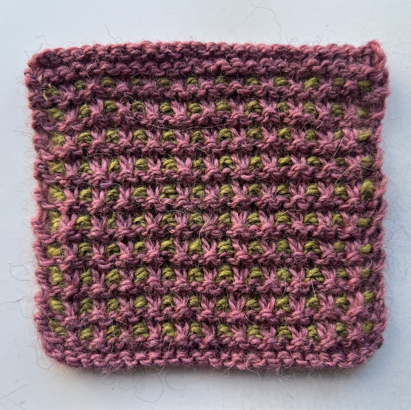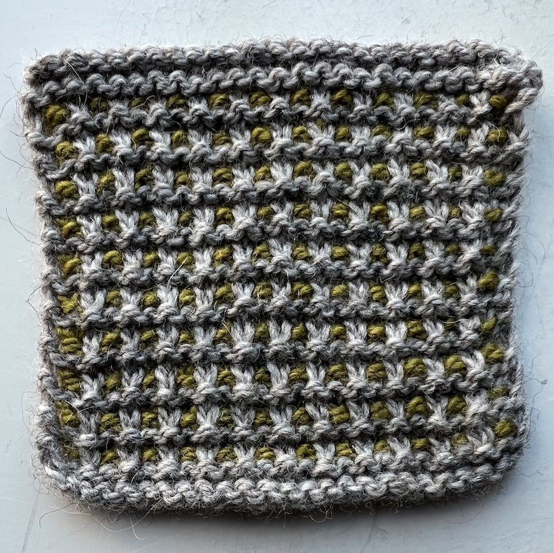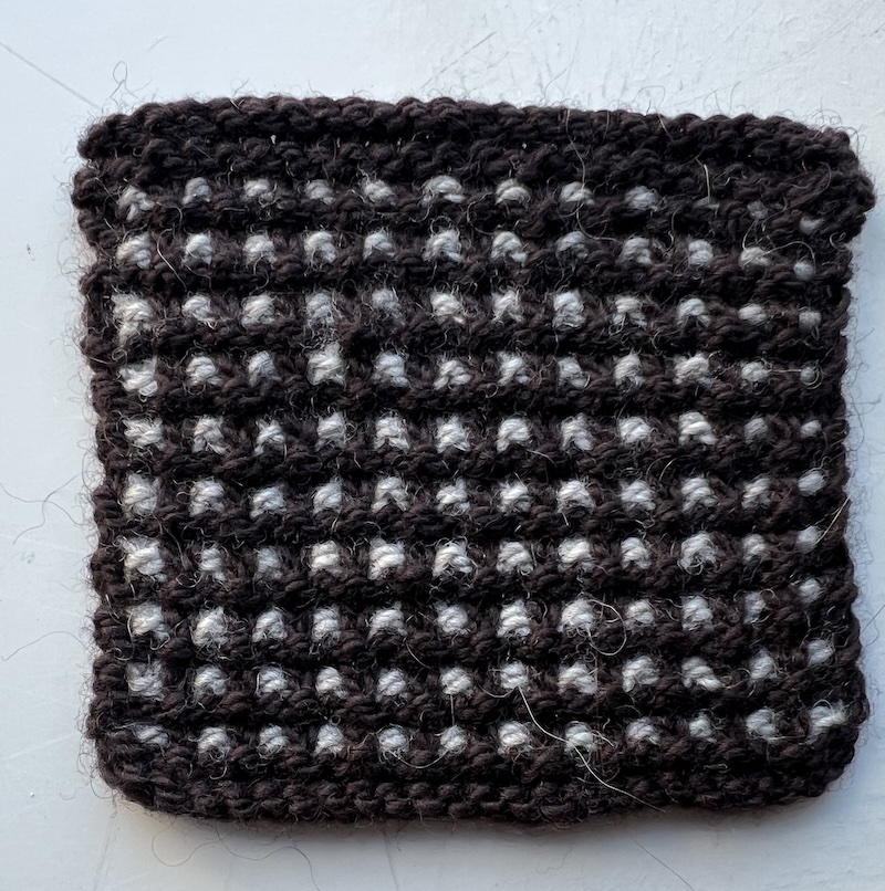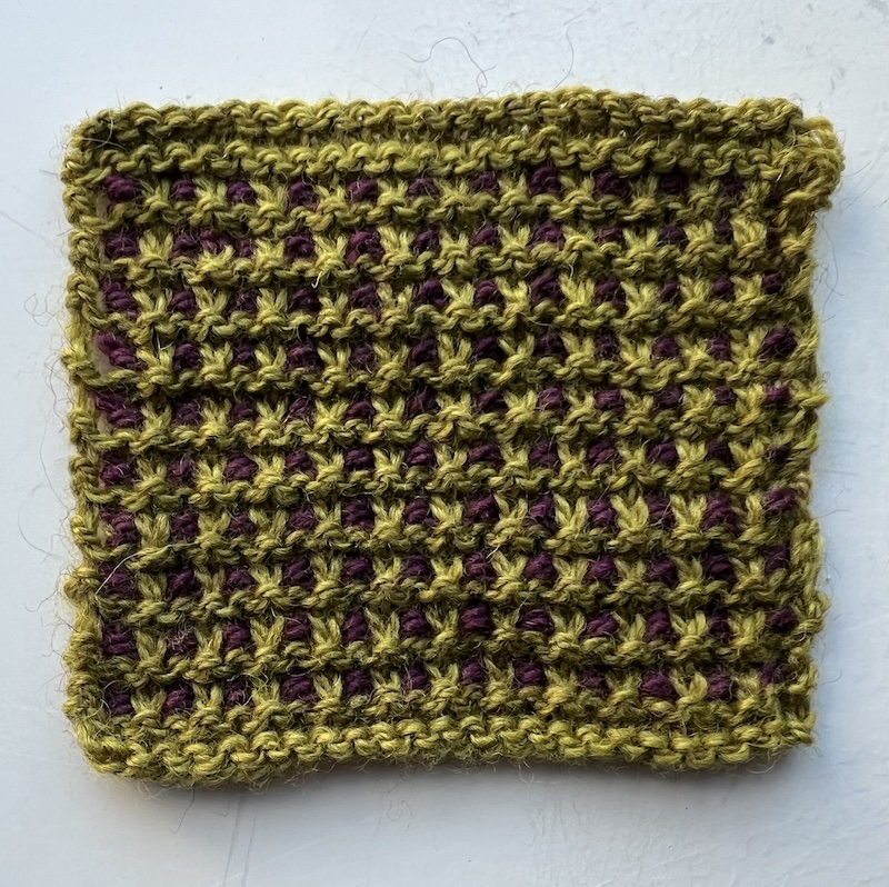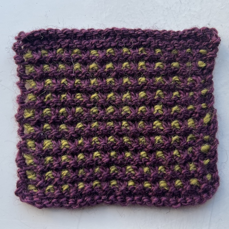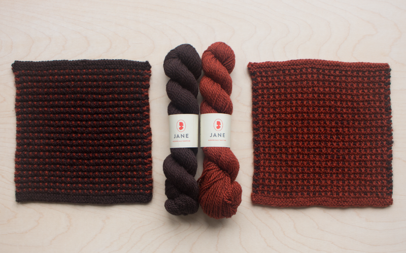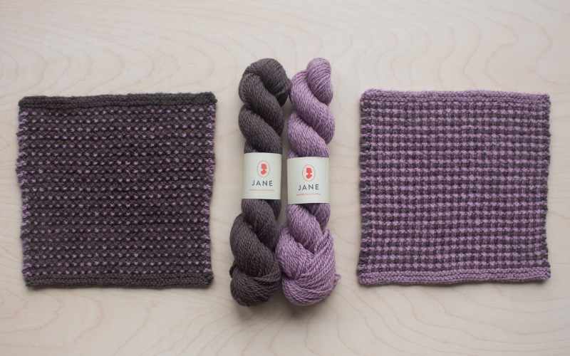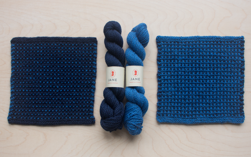 Because of the way the background grid of Color A dominates the twinkly dots of Color B in this mosaic stitch design, snapping a photo of two skeins side by side is not cutting it for the future sweater makers of our upcoming Bang Out a Sweater knitalong.