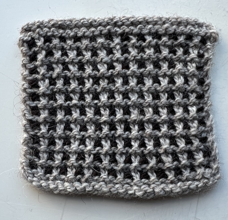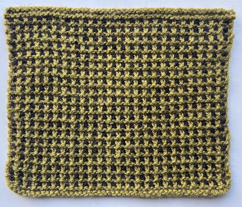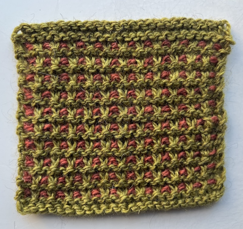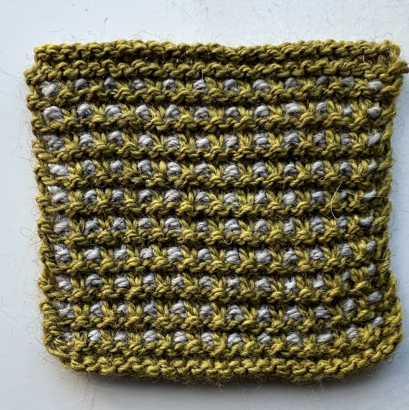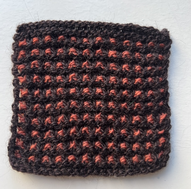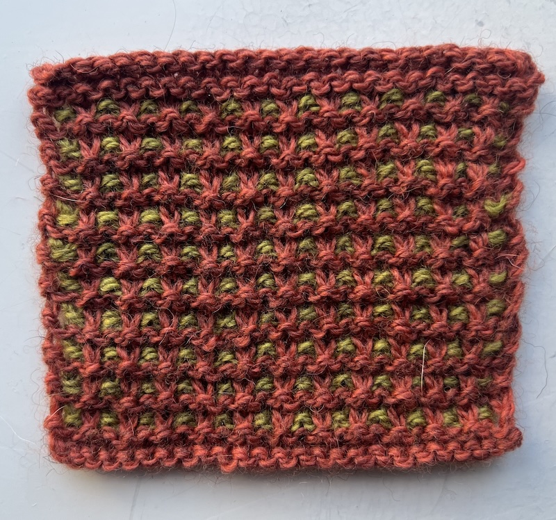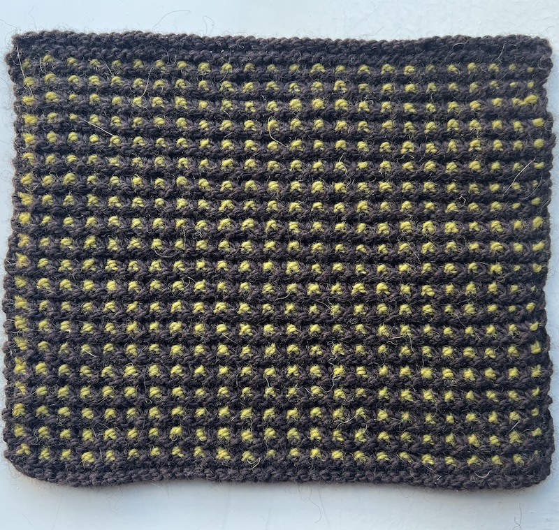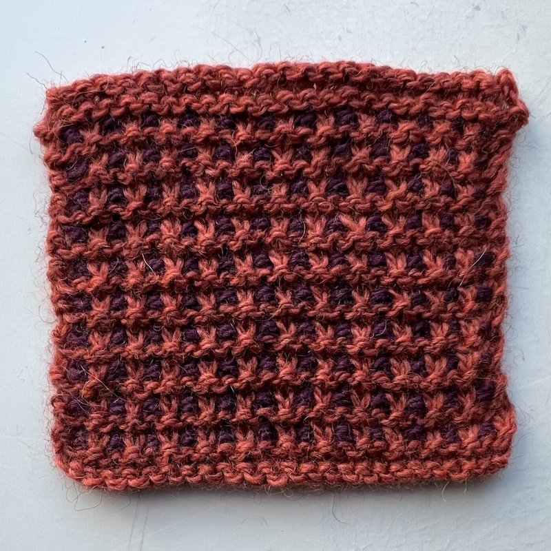 Because of the way the background grid of Color A dominates the twinkly dots of Color B in this mosaic stitch design, snapping a photo of two skeins side by side is not cutting it for the future sweater makers of our upcoming Bang Out a Sweater knitalong.