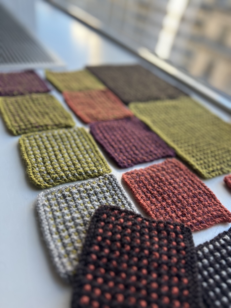 Important note. These flat swatches are a tasty and expeditious way to explore color pairings. If you are swatching for gauge, however, do heed the pattern’s instruction to swatch in the round. Here’s a helpful video from Laura Nelkin on a neat way to swatch in the round.