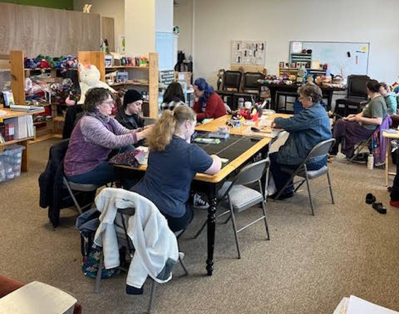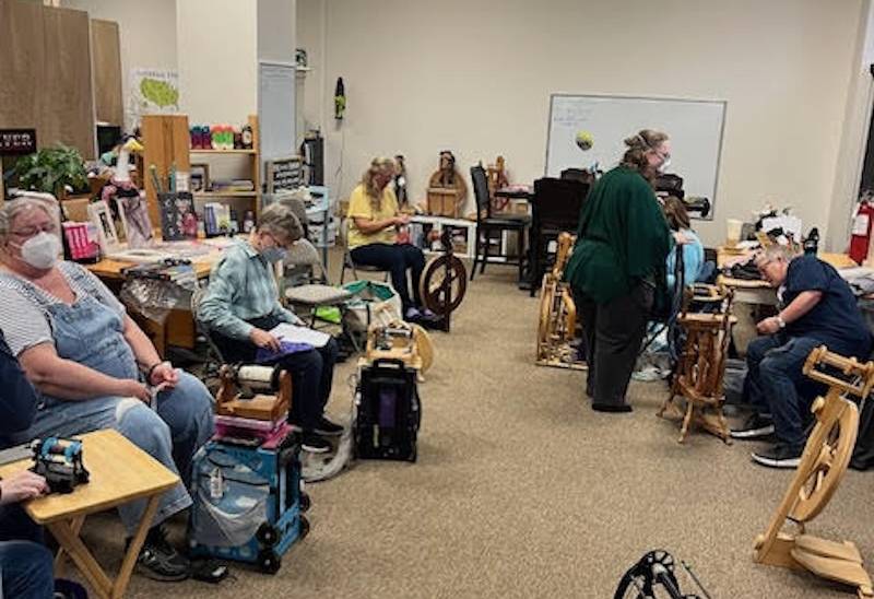 The Skagit Spinners, a local guild, meet at the shop once a month.